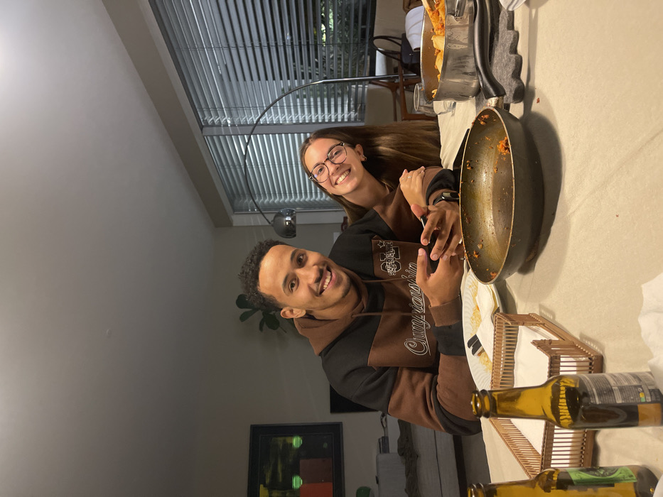 The image captures two young adults, a male and a female, seated at a dining table in an indoor residential setting located in Matosinhos, Portugal