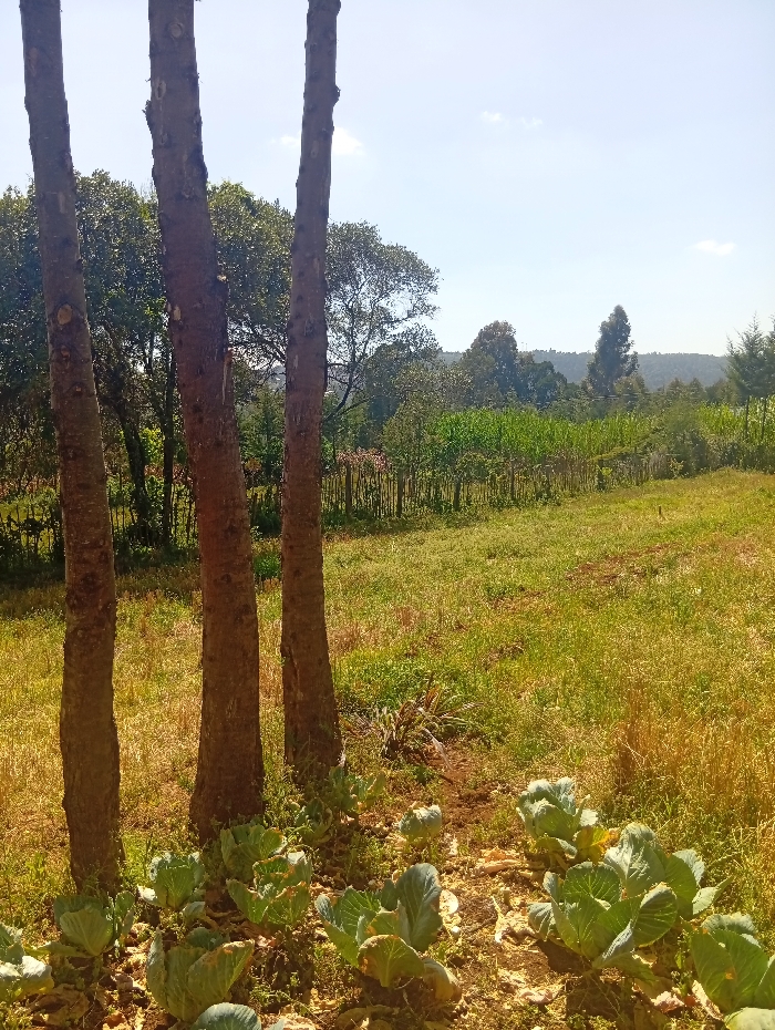 The image displays an agricultural landscape in Waseges ward, Kenya, under clear daylight conditions. In the immediate foreground, three prominent, debarked tree trunks stand vertically, their bases rooted in brown soil. Directly in front of and between these trunks, a cultivated patch features numerous young, green cabbage plants, indicating recent planting or growth. Beyond this patch, a field of predominantly dry, yellow-green grass extends horizontally. A rudimentary fence, constructed from thin, vertical wooden stakes, marks the boundary of this grassy area. Behind the fence, a more densely vegetated zone includes what appears to be other cultivated crops, possibly maize, and various species of mature trees forming a green canopy. The background reveals a distant undulating landmass or hills, also covered with trees, all beneath a bright blue sky with scattered faint white clouds. No people or animals are visible, and no overt actions or interactions are depicted. The scene conveys a rural, cultivated environment.