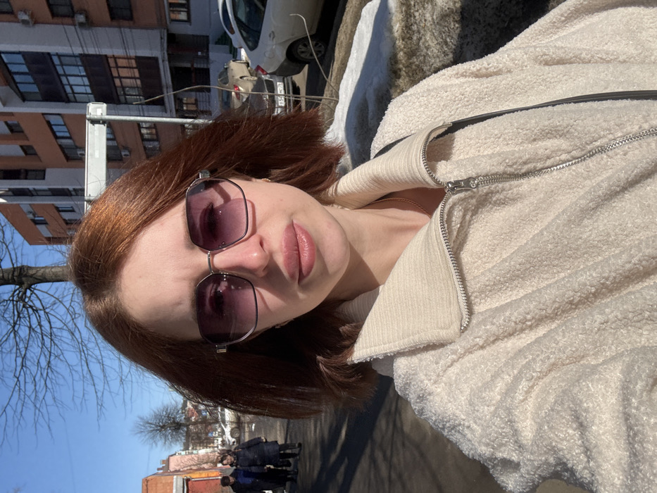 young adult female taking a selfie outdoors in an urban environment, specifically Rusanovo, Moscow Oblast, Russia. The subject has reddish-brown, shoulder-length hair and wears dark-tinted hexagonal sunglasses and a cream-colored, textured jacket with a high ribbed collar and a prominent silver zipper. A gold chain is visible around her neck. The background features a clear blue sky and bright sunlight, casting distinct shadows. To the subject's left, a paved sidewalk leads into the distance, where at least three individuals in dark clothing are walking away. Adjacent to the sidewalk, a reddish-brown brick building and bare deciduous trees are visible. To the subject's right, a multi-story residential building with orange and white facades stands, alongside a street where several cars are parked. A light-colored sedan has a Russian license plate partially visible as "750 MC 7." Patches of melting snow are present on the ground beside the sidewalk, indicating a transition season.