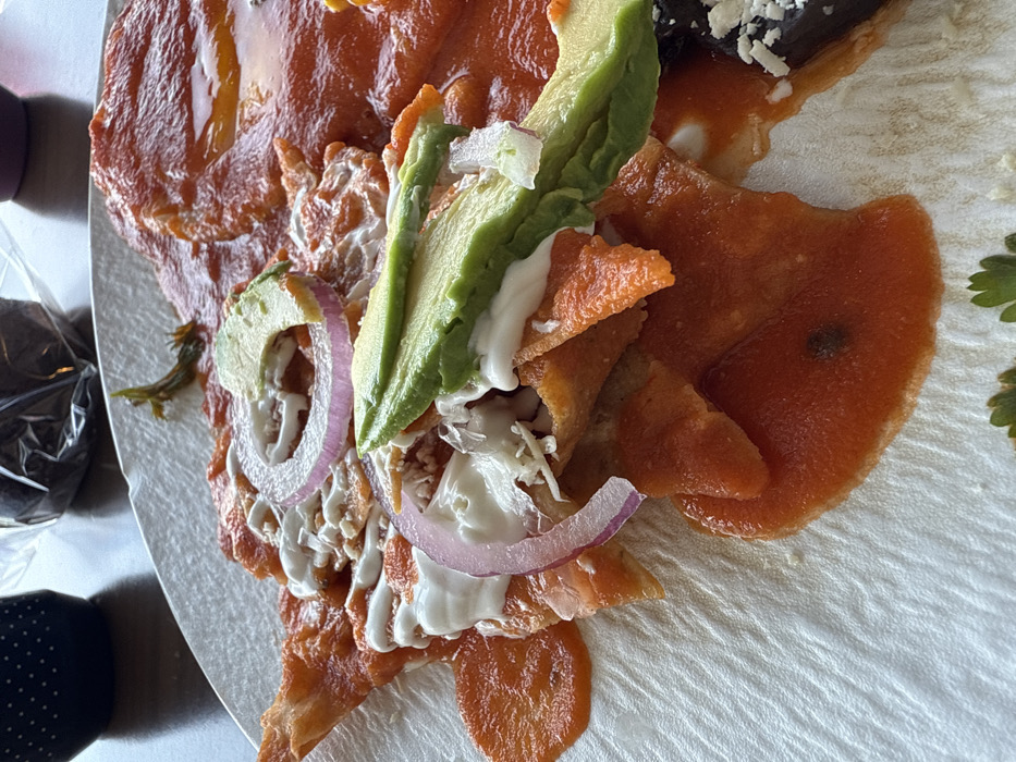 A close-up shot displays a plate of enchiladas. The tortillas are smothered in a red sauce, topped with sliced avocado, red onion, and a white cream. Hints of cheese and parsley garnish the dish. The plate's edge is visible, showcasing a textured surface. A container of salsa and a polka-dotted fabric are partially visible on the side.