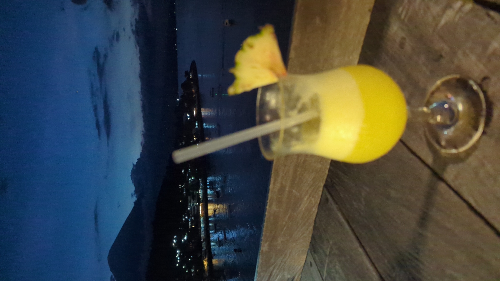 A cocktail is placed on a wooden surface. A straw and pineapple slice garnish it. In the background, there is a body of water with lights reflecting in it, indicating a city. In the distance, there is a dark landmass under a dark sky, likely a mountain or hill. Based on the city mentioned, the location is in Abang, Indonesia, but there is no other information about people, subjects, objects, actions, or interactions.