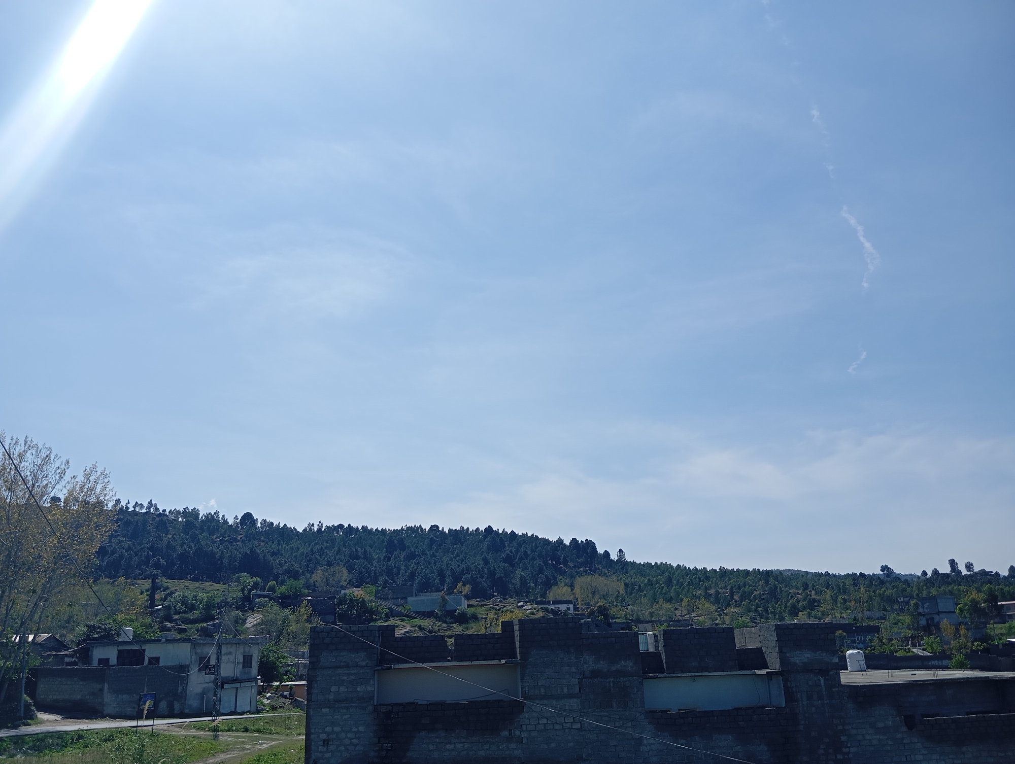 landscape with a clear, blue sky featuring a bright sun and a few wispy clouds. In the midground, there is a densely forested hill. The foreground contains several buildings, appearing to be made of concrete blocks. The buildings are in varying states of completion and seem to be a part of a residential area. The setting appears to be Lassan, Pakistan. There are no people visible in the image.