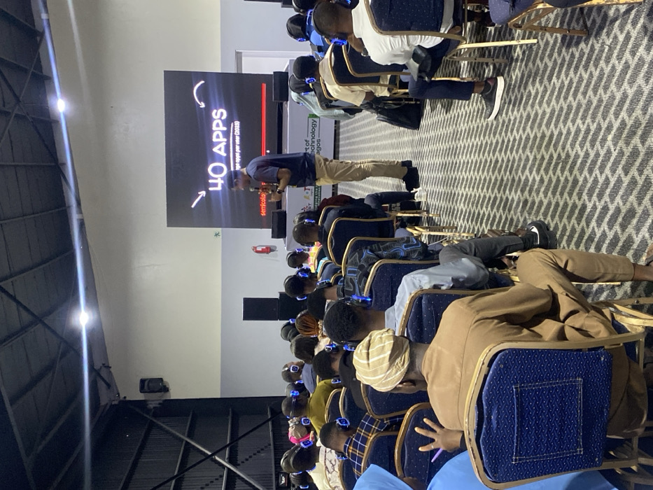 The image depicts an indoor event in an event hall located in Alaguntan, Lagos, Nigeria