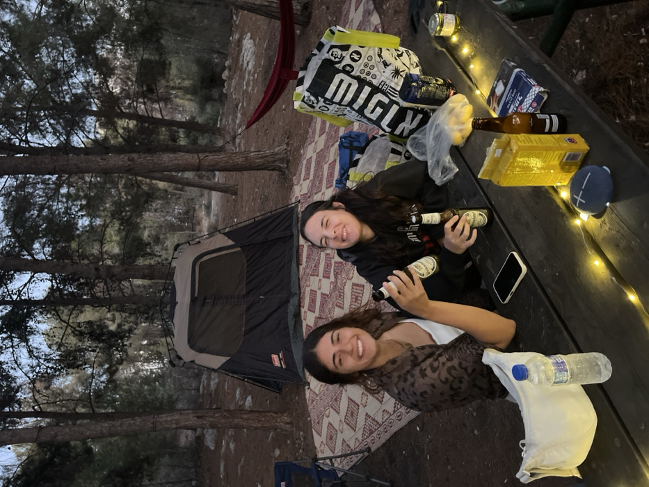 The image depicts an outdoor camping scene under dim light conditions, likely late evening or early morning, within the Mate Yehuda Regional Council, Israel. Two young adult females are seated at a weathered wooden picnic table, smiling towards the viewer. The female on the left, wearing a patterned overshirt and white top, holds a brown glass bottle. The female on the right, wearing a dark hoodie, also holds a brown glass bottle. The picnic table is adorned with a string of warm-toned LED fairy lights. Items on the table include a white smartphone, a clear plastic water bottle, a white fanny pack, a yellow carton, an additional brown glass bottle, a plastic bag containing yellow citrus-like fruits, a small glass jar with green items, and a small packaged item. A dark blue portable speaker rests on the table. In the background, a brown and black Coleman camping tent is erected on a patterned rug. A blue camping chair is partially visible to the left. A red hammock is suspended between two trees on the right. A large white tote bag with black graphics and Hebrew text, along with a blue duffel bag, are positioned near the table. The ground is covered with reddish-brown pine needles and scattered rocks, surrounded by tall, slender coniferous trees.