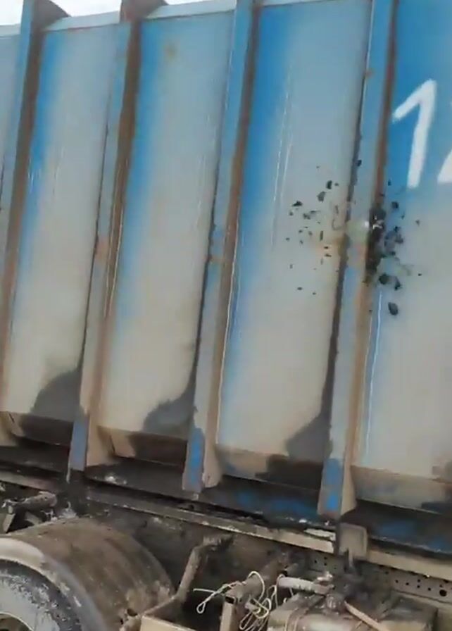 side of a light-blue dump truck with the number "12" painted on the side. The truck appears to be heavily used and dirty. There's some debris on the ground underneath the truck. The video seems to have been taken outdoors, likely in an industrial or construction environment. A brief clanging sound is heard.