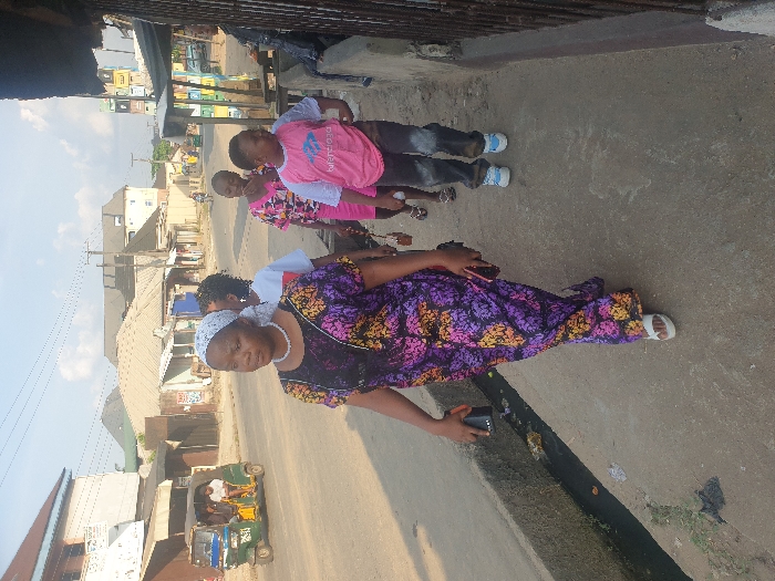A woman in a patterned dress and head covering stands on a street with children wearing brightly colored shirts in front of her. The street runs between buildings under a partially cloudy sky. A small motorized vehicle is visible in the distance. A narrow gutter is alongside the street where the woman is standing. The buildings and street are weathered. The woman is holding a phone.