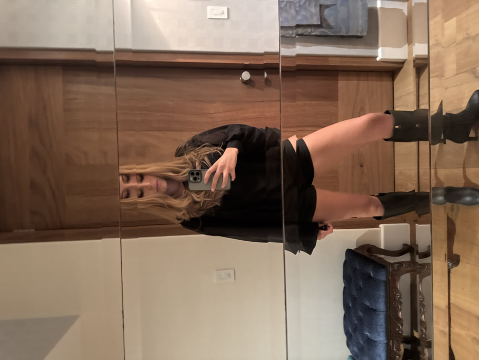 An indoor, full-length mirror selfie depicts a female subject with long, wavy blonde hair