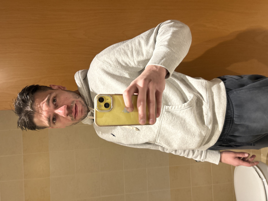 A male individual is depicted in an indoor setting, identified as Marousi, Greece, within what appears to be a bathroom. He is capturing his reflection in a mirror using a smartphone. The male, appearing to be a young adult, has short, dark, somewhat disheveled hair and light facial stubble. He is dressed in a light grey hooded sweatshirt with a small, dark embroidered logo on the left chest, and dark grey sweatpants. He holds a yellow-cased smartphone, identified as an iPhone with a triple camera system, in his right hand. His left hand is positioned loosely at his side. The background to the left consists of light beige square wall tiles and a partial view of a white toilet bowl. The background to the right features a plain, light brown wooden surface, likely a door or wall panel. The scene is illuminated by direct, artificial lighting.