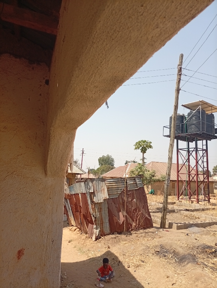 The image depicts an outdoor scene in Barikin Gidar Kanat, Nigeria, under a clear, bright sky, suggesting daytime. The perspective is from beneath an arched light-brown, textured wall or overhang, which occupies the upper left and central foreground. Directly below this overhang, on the dry, dusty ground, a young child wearing a red shirt and light-colored shorts is seated, looking down at an object in their hands or on the ground. A light-colored sandal is partially off the child's left foot. To the left and slightly behind the child, a makeshift structure constructed from multiple pieces of rusty, corrugated metal sheeting stands leaning on uneven ground. The immediate ground surface is dry earth with minimal vegetation. Further right, a rustic wooden utility pole supports multiple overhead wires. In the background, a metal tower supports two prominent black cylindrical water tanks and a white canopy, likely containing solar panels. Several other single-story buildings with reddish-brown corrugated metal roofs are visible in the mid-to-far background, interspersed with trees and sparse foliage. Shadows indicate sunlight from the right, suggesting a morning or early afternoon setting.