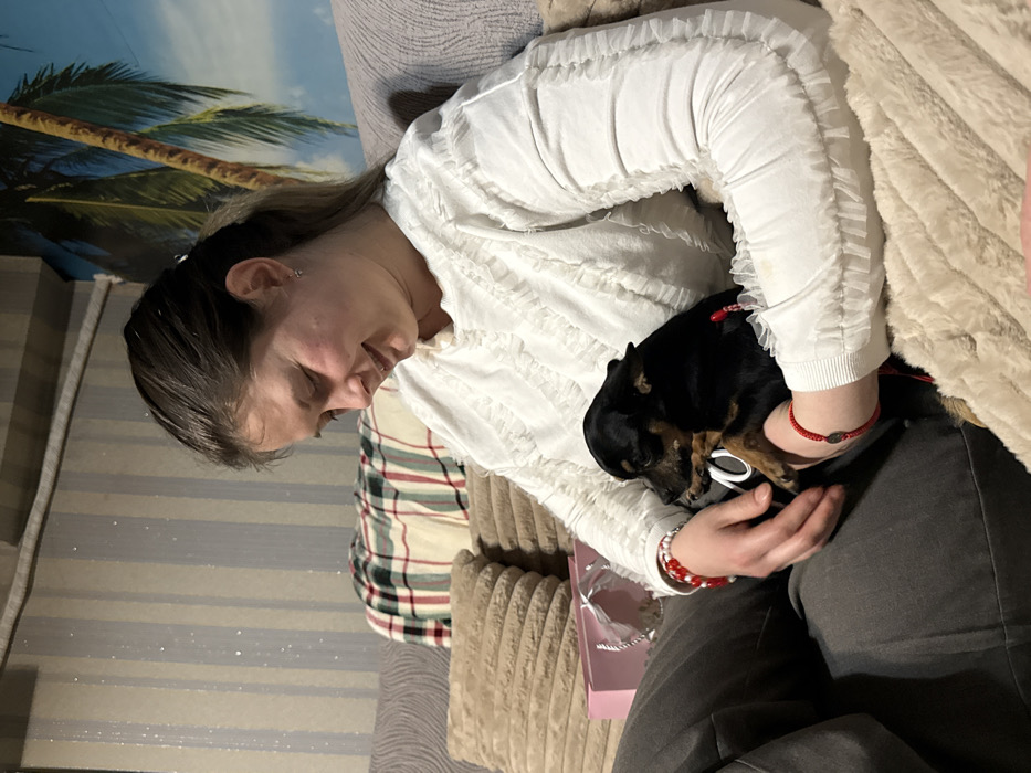 The image depicts an indoor scene in Sarnevo, Bulgaria. A young adult female with light-brown hair pulled back is seated on a light-colored sofa, holding a small black and tan dog in her lap. She wears a white long-sleeved top with ruffle detailing and dark grey trousers. Her left wrist displays multiple red and white beaded bracelets, while her right wrist has a single red beaded bracelet. She is smiling and looking down at the dog, which is resting with its eyes appearing closed. A white strap or lead is visible around the dog's neck. To the left of the female's leg, a pink gift bag with a white ribbon is positioned on the sofa. The background on the left features vertically striped wallpaper with subtle reflective flecks, and a plaid blanket draped over furniture. The background on the right shows a mural depicting palm trees against a blue sky. Several textured pillows are visible on the sofa.