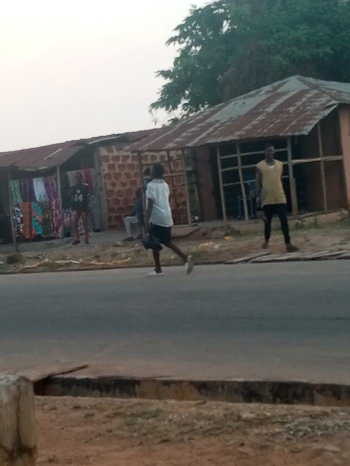 A street view features several people in front of makeshift shops. A person in a white shirt and dark shorts is walking across the road. Another person wearing a yellow tank top and dark pants is standing near a partially constructed shop with a corrugated metal roof. Additional individuals are visible near a shop displaying colorful textiles. A concrete barrier and drainage ditch are in the foreground, with trees visible in the background.