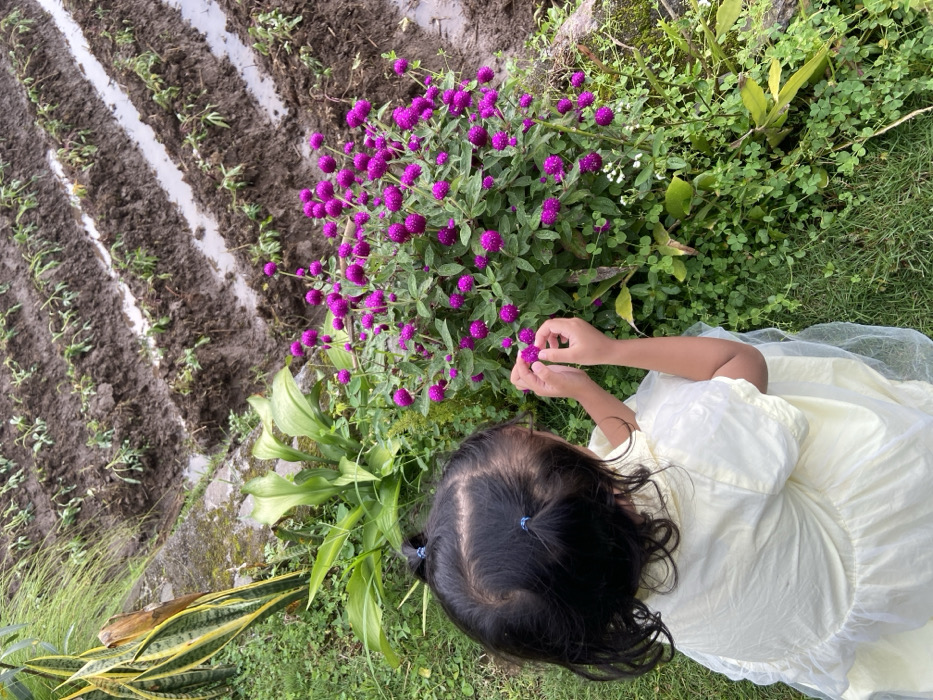 A young girl in a light-yellow dress is lying on the grass near a bush of purple globe amaranth flowers. She is holding a flower in her hands. Adjacent to the grass are rows of cultivated soil with small plants sprouting. A snake plant and broad-leafed plants grow nearby. Clover and other green vegetation surround the flowers and grass.