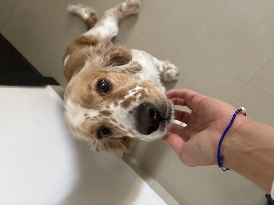 A tan and white Cocker Spaniel lies on its side on a beige tile floor. The dog has brown eyes and a black nose, and is looking up. A hand wearing a blue beaded bracelet with a white pearl is holding a white, stick-like object near the dog's mouth. A black object is partially visible in the upper left corner.