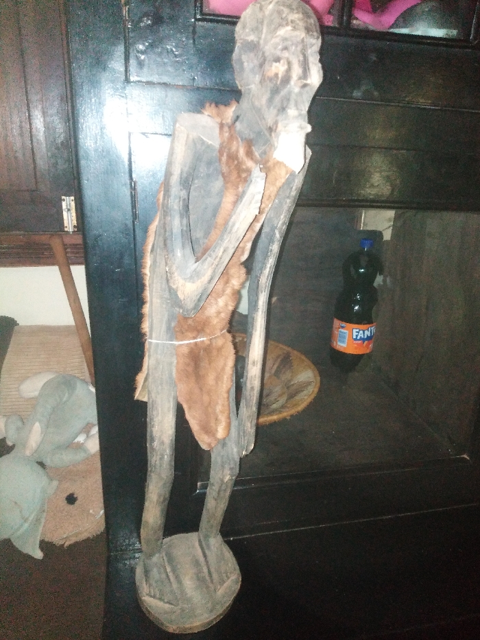 A tall, wooden figure stands on a round base. It has a thin frame and what appears to be a fur garment tied around its chest. Behind the figure, a Fanta bottle and a shallow, woven basket sit inside a dark cabinet. Toys are visible to the left of the figure. The cabinet is black.