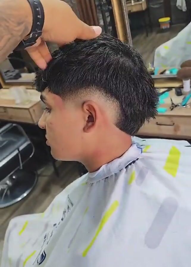 In a barbershop, a young man sits in a barber's chair wearing a white and yellow patterned cape. A barber, visible only by his tattooed arm and hand wearing a black watch, adjusts the young man's dark, short, textured hair, which has a faded undercut. The young man looks off to the side with a serious expression. In the background, there's a salon-style mirror, barber's tools on a wooden counter, and a second barber chair. Music plays in the background.