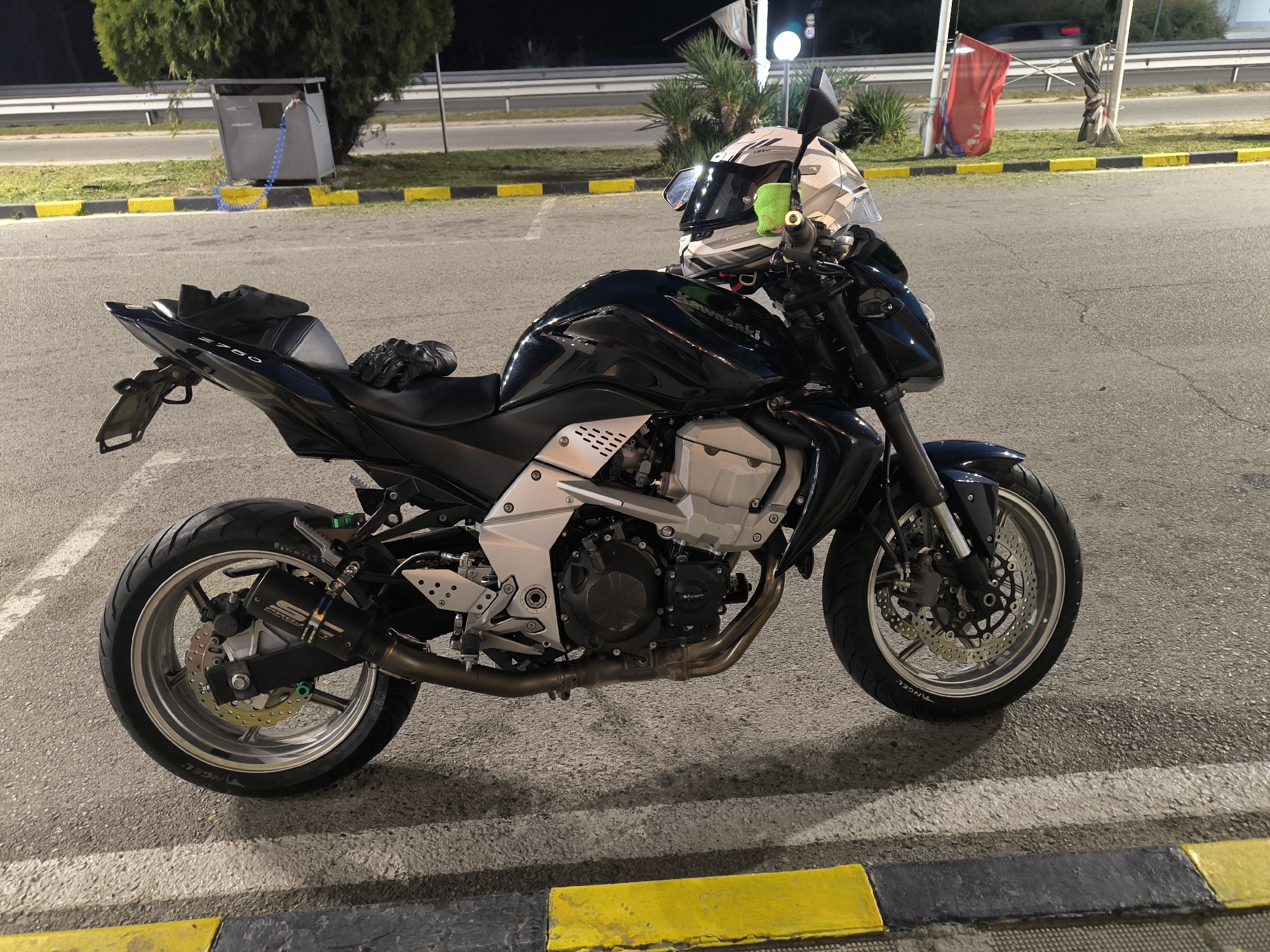 A black Kawasaki Z750 motorcycle is parked on an asphalt surface, marked with faded white lines, adjacent to a curb painted with alternating yellow and black segments. A white and gray patterned full-face helmet, featuring a dark visor and a small green fabric item, rests on the motorcycle's handlebars. Black riding gloves are placed on the rear seat. The motorcycle exhibits silver-colored engine and frame components, an aftermarket SC-Project exhaust system, and Pirelli Angel tires. The scene is illuminated by artificial lighting during nighttime. In the background, beyond a narrow strip of grass and landscaping with various trees including a large conifer and palm trees, a light-colored metal utility box with a coiled blue and yellow cable is visible. Further back, a road with a metal barrier, streetlights (one displaying a "40" speed limit sign), and partially obscured red and dark flags or banners are present. A blurred vehicle moves in the distant background. This scene is located in the city of Piperevo, Bulgaria.