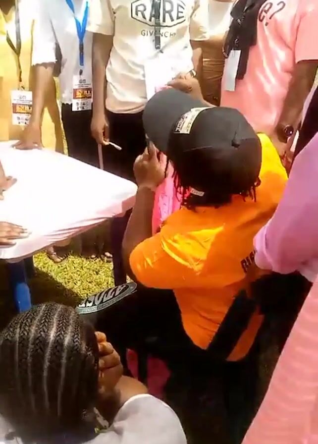 The scene shows a group of people gathered around a table. A woman in an orange shirt is sitting on a chair and holding a piece of pink fabric. She appears to be demonstrating or teaching something to the group. Several other women are standing around the table, watching her intently. They are dressed in casual clothing, some with head coverings. A young girl with braided hair is sitting on the ground in front of the seated woman, also observing. The table is covered with a white cloth, and there are some objects on the table. The setting appears to be outdoors, possibly in a park or schoolyard, with greenery visible in the background.