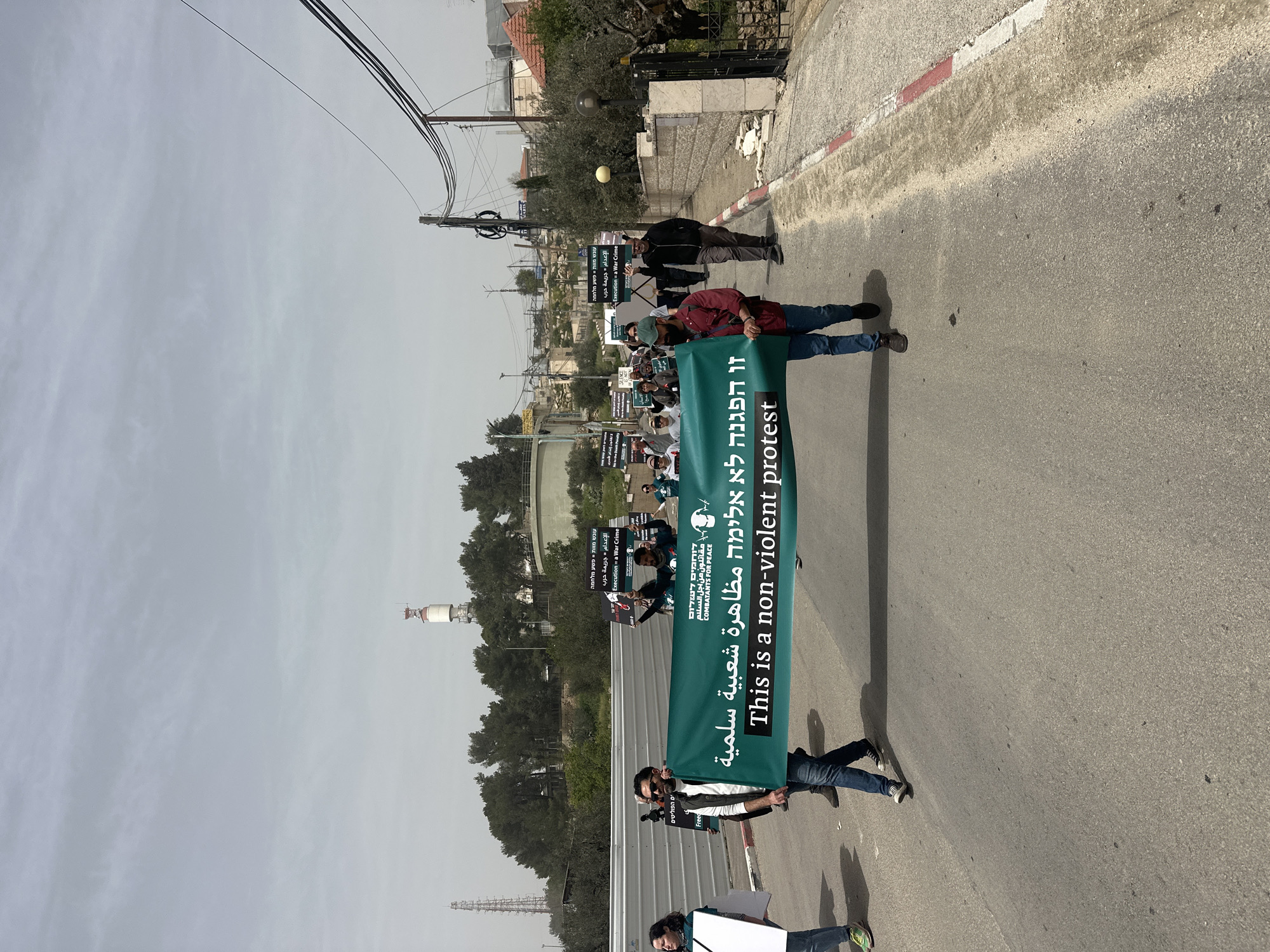 protest in a-Doha, Palestinian Territory. There is a group of people marching down a street, holding signs and a large banner. The banner reads "This is a non-violent protest," in English and Arabic. Some of the signs say "Execution = War Crime" in English and Arabic. Other signs read "Combatants for Peace" in English, Arabic, and Hebrew. The group is walking on an asphalt road. In the background, there are trees, buildings, and a communication tower. Overhead, there are electrical cables.