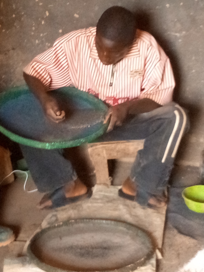 A man sits on a small wooden stool, focusing intently on a large, round, green-rimmed pan that rests on his lap. He wears a red and white striped shirt and dark pants with a white stripe down the side. Sandals are on his feet. Another similar pan rests on the ground in front of him. A small green bowl sits to his right. The scene appears to be indoors.