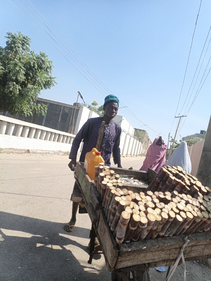 In Tarauni, Nigeria, a young adult male pushes a two-wheeled wooden cart along a paved asphalt road under a clear blue sky. He is dressed in a dark blue/purple long-sleeved tunic, dark shorts, yellow flip-flops, and a teal knitted kufi cap, holding a long wooden pole. The cart is heavily laden with numerous short, cylindrical sections of sugarcane, a yellow plastic jerrycan with a red cap, and a shallow tray containing small, dried fish. In the background, two individuals are partially visible; one wears a pink full-body covering and the other a light blue full-body covering. To the left, a white concrete balustrade separates the road from a walled compound featuring a dark corrugated metal gate and a prominent green tree. Overhead power lines traverse the clear sky, with a utility pole visible on the right. The scene is brightly illuminated by direct sunlight, casting sharp shadows on the road surface.