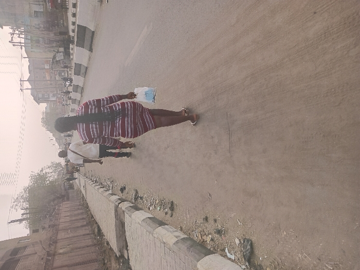 A woman with long, dark hair walks down a street, wearing a striped maroon and white dress. She carries a package in her left hand. A man in a white shirt and dark pants walks slightly behind her. The street is wide and dusty, bordered by a sidewalk with a black and white curb. Buildings line the street in the distance, and there is a hazy quality to the air.