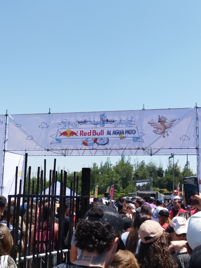 This image depicts a dense outdoor gathering under a clear blue sky, likely within a park setting in Quinta Normal, Chile. A large white banner, supported by a metal truss structure, spans the upper midground, functioning as an event entrance or archway. The banner displays the text "Red Bull AL AGUA PATO" in red, accompanied by cartoon illustrations including a Red Bull can, bicycle handlebars, water splashes, a red and white lifebuoy, a yellow bell, and a stylized duck-like bird in flight. In the foreground, a large crowd of individuals, predominantly observed from the back of their heads and shoulders, congregates. They are dressed in casual attire, with many wearing hats or caps. A black metal barrier composed of vertical bars partially obstructs the view of the crowd's lower half. Visible individuals include a person with dark, curly hair and a "222" tattoo on the back of their neck, positioned in the lower center. To the right, a hand is visible holding a smartphone, pointing towards the event. The crowd appears to be either queuing or observing an activity beyond the frame. The background features a dense line of green trees under bright sunlight. Further back, a screen or stage structure is dimly visible behind the crowd. The overall environment suggests a sunny, fair-weather event.