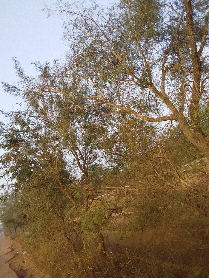 This image, located in Oturkpo, Nigeria, presents an outdoor scene dominated by natural vegetation. The central and right portions of the frame are densely populated with several mature trees, characterized by extensive networks of brown branches and varying densities of light to dark green foliage. The sky, visible in the upper third, is a uniform, pale blue with no discernible clouds. The lower third of the image shows a ground covered in dry, yellowish-brown grass and smaller shrubs. On the far left, an unpaved, reddish-brown dirt road or path runs parallel to the treeline, curving slightly into the distance. There are no human figures, animals, man-made structures, or overt actions or interactions visible within the frame.