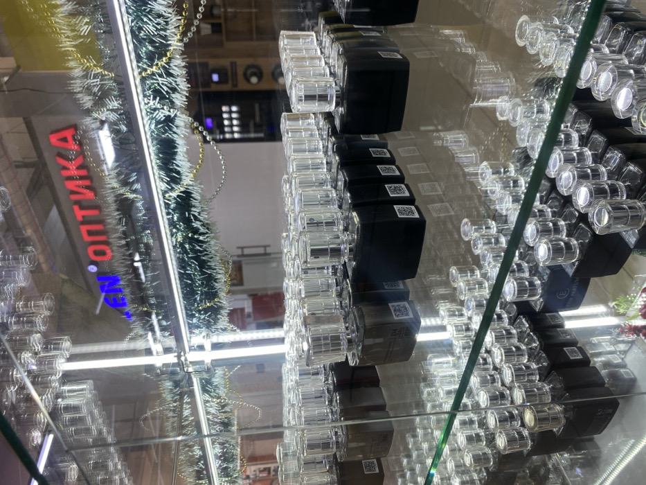 A display case features rows of black perfume bottles with clear, cylindrical caps. Some bottles have visible QR codes on top. Reflections create a mirrored effect, doubling the number of bottles. A Christmas garland with silver and gold beads adorns the upper-left corner. A store sign with the word "ОПТИКА" in red and other text in blue is reflected in the glass. The lighting is bright and even.