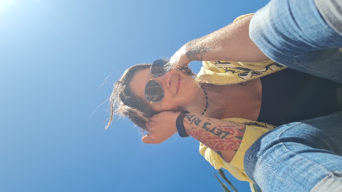 This image captures an individual against a clear blue sky in Nahariyya, Israel. The subject is a female, photographed from a low-angle perspective, appearing seated or reclined and looking towards the camera with a slight smile. She wears aviator-style sunglasses with dark, reflective lenses. Her short, dark hair is somewhat disheveled, with strands appearing windblown. A dark, beaded choker necklace is visible around her neck, and she has a piercing on her left nostril. She is clothed in a black tank top beneath an open yellow zipped hoodie featuring dark graphic designs. Blue denim jeans cover her lower body. Tattoos are visible on both forearms: the left forearm (viewer's right) displays red and black text "LET'S RIDE" integrated with patterns, and the right forearm (viewer's left) shows black abstract patterns. A dark fitness tracker is worn on her left wrist. Her hands are positioned near her head, with fingers slightly spread. Strong sunlight originates from the upper right of the frame, creating visible highlights. A few green, spiky plant leaves are partially visible on the far left side of the frame, with the rest of the background consisting solely of a bright blue sky.