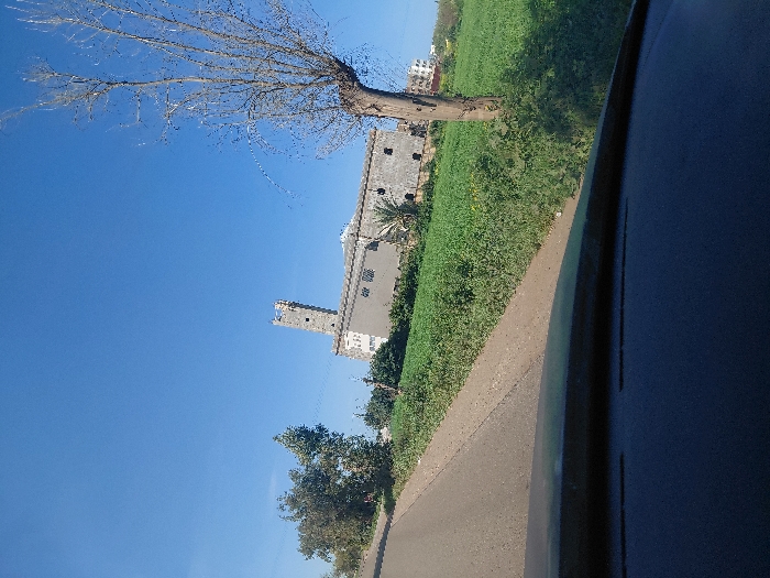 The image depicts a rural or semi-urban landscape in Sidi Moussa Ben Ali, Morocco, viewed from within a vehicle. A paved road runs diagonally from the lower left to the mid-left. To the right of the road is an expanse of green vegetation, possibly agricultural fields, sloping upwards. A prominent, tall, deciduous tree with bare branches stands in the mid-right foreground, with a thick trunk. In the mid-ground, beyond the green field, a light-colored building with a tall, slender, rectangular minaret-like tower on its left side is visible. This building appears to be constructed of concrete or stone, with multiple rectangular window openings. Further in the background, to the right of the primary building, additional structures are visible, suggesting more distant development. The sky is clear and bright blue. No individuals, animals, or active interactions are present in the scene.