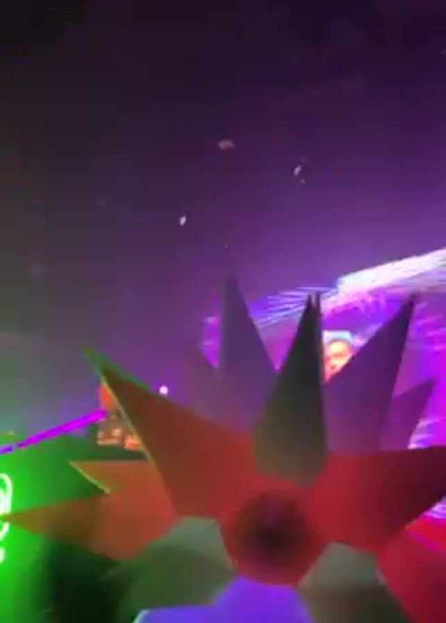 The video captures a lively scene at a rave, identifiable by the vibrant lighting and neon decorations