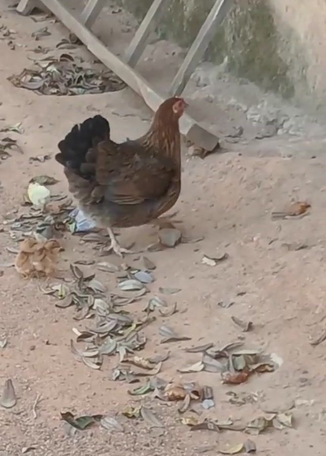 - "A brown hen with a black tail stands on the ground covered with brown leaves" by FM-EgUYT2, licensed under CC BY 4.0