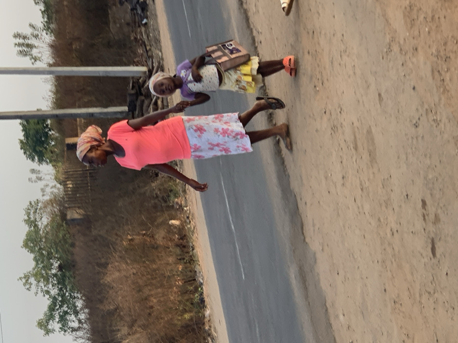 Two women, one older and one younger, are walking along a road. The older woman is wearing a pink shirt, floral skirt, and headscarf, while the younger woman is wearing a purple shirt, white skirt, and carrying a small bag. They are holding hands and walking on the side of the road. The road is bordered by dry vegetation.