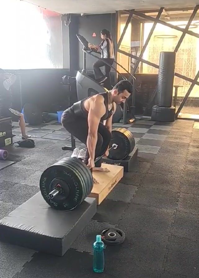 In a well-lit gym with a rubberized floor with grey and black tiles, a muscular man in a black tank top and pants is performing a deadlift