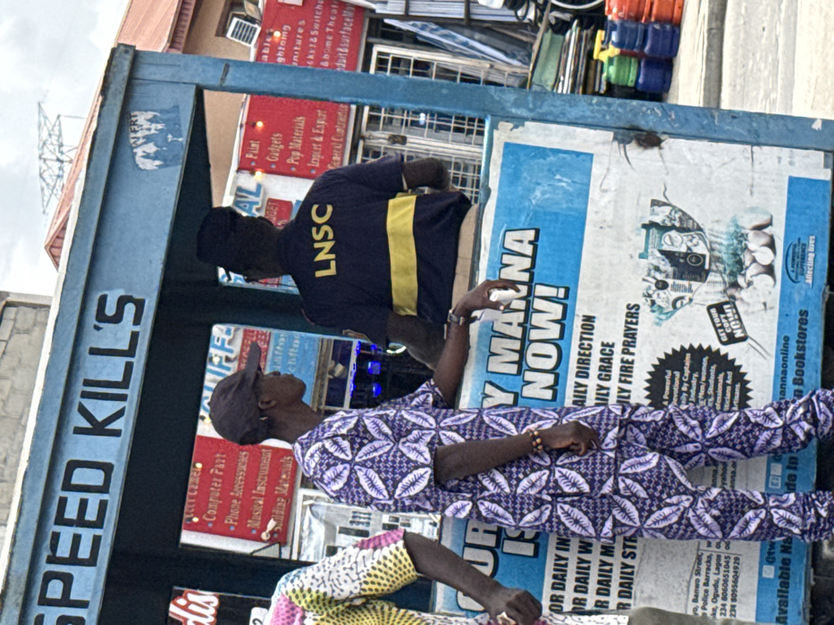 The image depicts an outdoor street scene in Ado, Nigeria, focused on a blue wooden kiosk