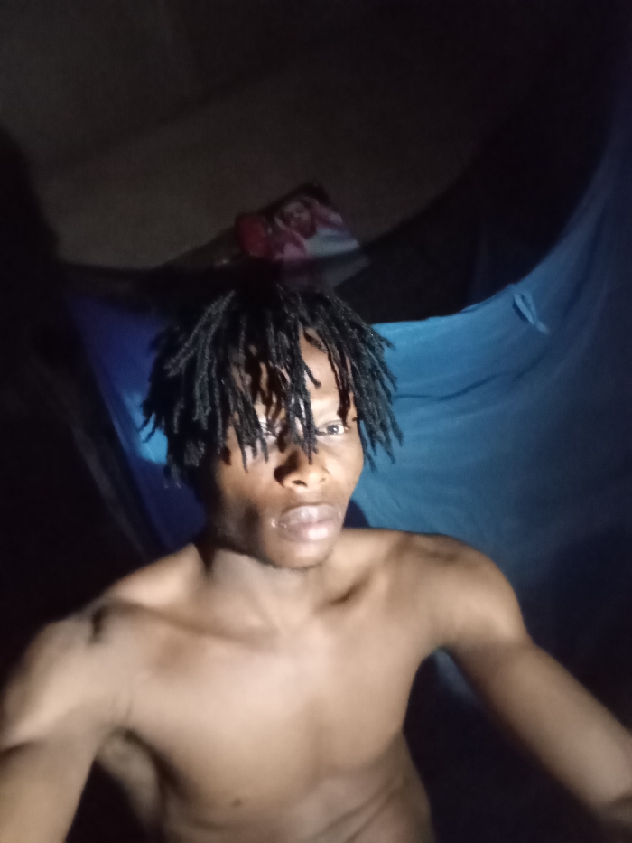 The image displays an adult male, with dark skin and black dreadlocks that partially obscure his forehead, located in the city of Unknown, Unknown. He is depicted from the mid-chest up, bare-chested, directly facing the camera with a neutral gaze. The setting is indoors, characterized by very dim lighting, suggesting a nighttime or dark room environment. To the subject's right, a large section of dark blue, possibly translucent fabric, consistent with a mosquito net or draped cloth, hangs. The upper left background reveals a dark, indistinct surface, possibly a wall, with a faint, blurred object containing red and white elements visible further back. The subject appears to be taking a self-portrait, with direct light illuminating his face and upper body against the dark background.