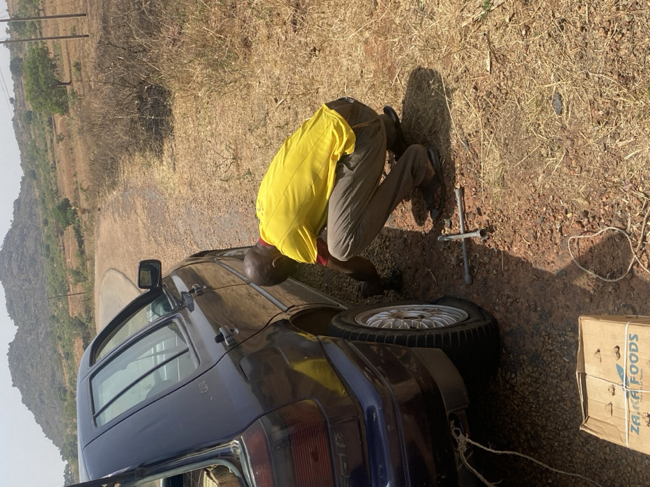 In Ganawuri, Nigeria, a male individual is observed in a crouching position beside the rear driver's side wheel of a dark-colored four-door hatchback vehicle, potentially a Volkswagen Golf Mk3. He wears a yellow short-sleeved shirt with red trim, khaki trousers, and dark sandals. His attention is directed towards the wheel area, suggesting engagement in a tire-changing operation. A four-way lug wrench rests on the reddish-brown dirt ground directly in front of him. The vehicle's rear driver's side tire appears deflated. The car is parked partially on a narrow, asphalt road that curves into the distance and partially on the dirt shoulder. The trunk of the vehicle is slightly ajar. A cardboard box labeled "ZA-KA FOODS" is located on the ground behind the car, adjacent to a white rope or cord. The surrounding environment consists of sparse, dry vegetation, including grasses and small shrubs, under bright daylight conditions. In the background, arid-looking hills or mountains rise, with utility poles visible along the roadside.