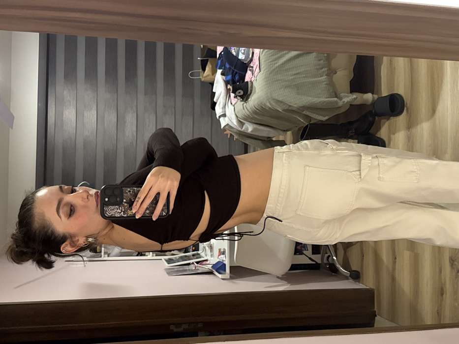 A young woman poses in front of a mirror, holding her phone up to take a picture. She wears a long-sleeved, dark brown cropped top and light-colored cargo pants. Behind her, a bed is covered with clothes and bedding, including a light green throw. A pair of black shoes sit on the floor near the bed. The scene takes place in a room with gray vertical blinds. The bottom edge of the mirror's frame is visible, with a glimpse of furniture beneath.