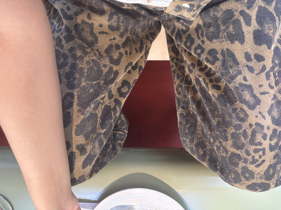 The image, captured from a first-person, downward-angled perspective, displays a person's lower right arm and lap while seated at a table. The arm, exhibiting a light skin tone, is positioned on the left side of the frame. The individual wears a garment, likely a jacket or shirt, made of a heavy fabric resembling denim, characterized by a prominent leopard print pattern featuring dark brown to black spots on a brownish-tan base. Visible garment details include a portion of a sleeve on the upper left and a section on the right showing stitching and a silver-colored metal snap fastener, consistent with a lapel or collar edge. To the far left, a segment of a light olive-green tabletop is visible, upon which a white round plate rests. A silver-colored metal fork is present on the plate, which also shows minor food residue. A solid reddish-brown surface, possibly a wall or booth seating, occupies the background behind the individual and the table. The exact location in Yerevan, Armenia, is not discernible from the visual information provided within the image.