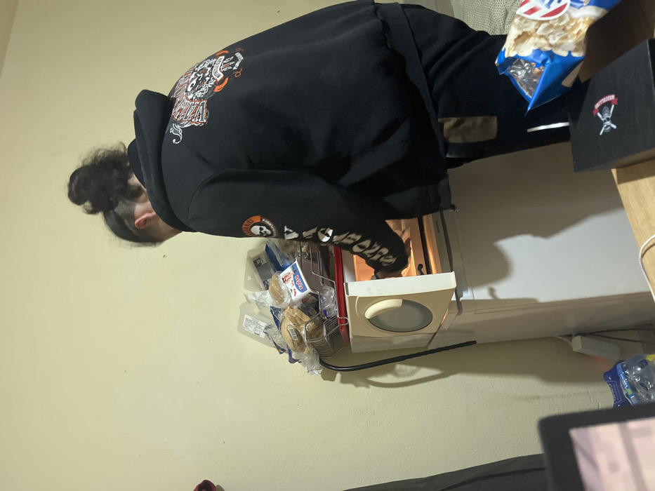 An indoor scene in Stara Zagora, Bulgaria, depicts a lone individual from a rear-left perspective, attending to a small oven. The subject, with dark, curly hair tied into a messy bun with closely cropped sides, wears a black hooded sweatshirt. The sweatshirt features an elaborate orange and black graphic on the back, including a skull and text, and a circular skull emblem with text on the left sleeve. Dark trousers with a vertical light-colored stripe are also visible. The individual is leaning over an open, white or off-white toaster oven or small electric oven, with hands inside its illuminated cavity. The oven rests atop a larger, white, vertical appliance, likely a refrigerator. Above the oven, a metal basket holds a collection of packaged food items, including buns or pastries, some marked with the "Дена" (Dena) brand, and clear plastic containers. A dark electrical cable runs down the light yellow wall behind the appliances. In the lower foreground, a wooden surface displays an open blue and white bag of snacks, consistent with "Chio" brand packaging, and a black box with a white skull emblem. The corner of a laptop screen is partially visible on the far left, and a plastic water bottle and a white power strip are located on the floor nearby.