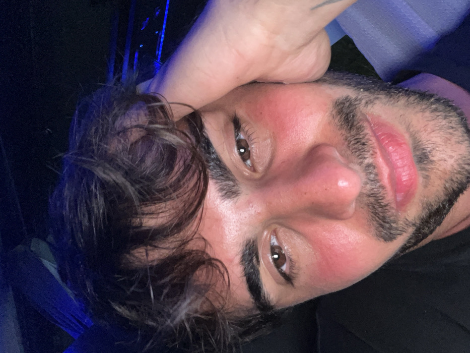 A close-up selfie captures a light-skinned man with dark hair and a beard. His face is slightly flushed. He gazes directly at the camera with brown eyes. His lips are pink and full. His hand is resting on his forehead, partially obscuring his hair. The background shows hints of dark and blue tones. The photo has been rotated, so the subject appears tilted.