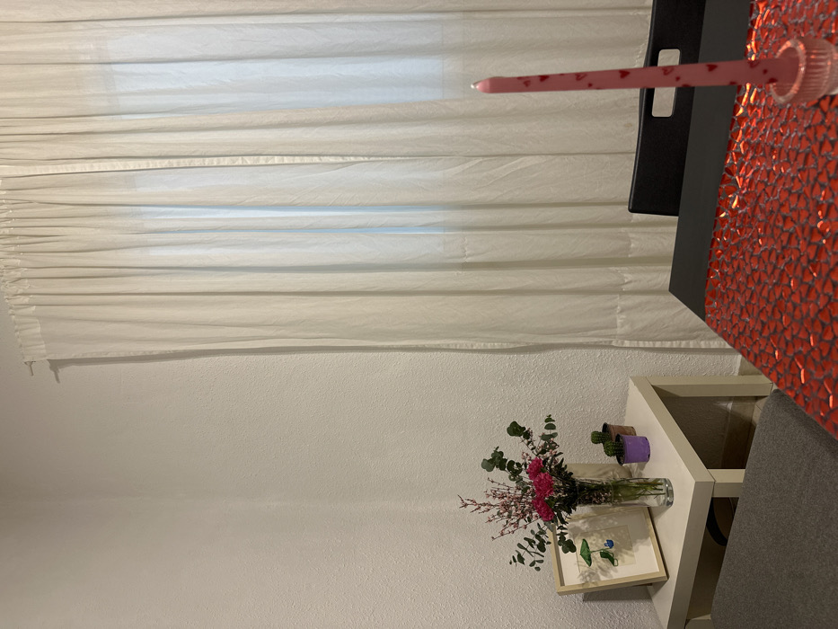 The image displays an interior room, located in a residence within Madrid, Spain, as indicated, though no specific geographical identifiers are visible in the scene itself. The room features textured white walls. On the right, a large window is covered by pleated, sheer white curtains, allowing ambient light into the space. In the left portion of the image, a white, square, two-tiered side table is positioned against the wall. On its surface, a clear glass vase holds a floral arrangement consisting of pink and fuchsia-colored flowers, along with green eucalyptus branches and other delicate red-flowered foliage. Leaning against the wall, beside the vase, is a light wood-framed picture depicting a green beach umbrella and two blue beach chairs on a light background. Two small potted cacti, one in a purple pot and another in a brown pot, are also arranged on the table next to the vase. A dark gray upholstered furniture piece, possibly a sofa or ottoman, is partially visible in the lower-left foreground. In the foreground on the right, a dark-colored table is partially covered by a reflective red placemat or table runner featuring a textured, possibly heart-shaped, pattern. Centered on this placemat is a tall, unlit pink taper candle adorned with small red heart motifs, standing upright in a clear, ribbed glass candle holder. The back of a dark chair is visible behind the table. No people are present in the scene, and no specific actions or interactions are depicted beyond the static arrangement of objects.