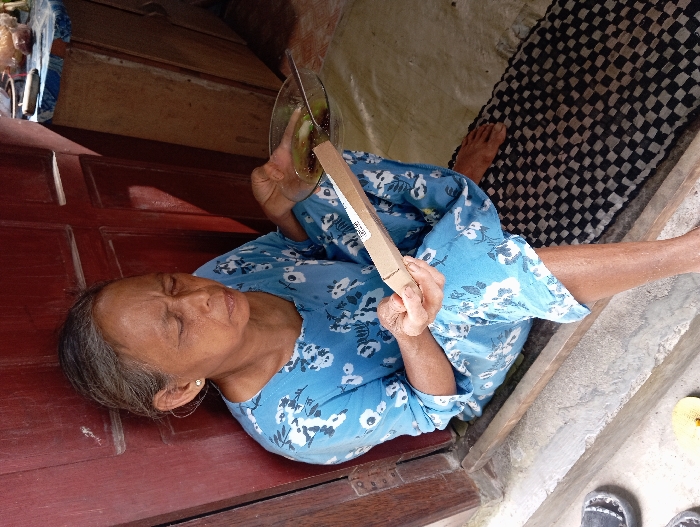 An elderly woman wearing a blue floral dress sits near a doorway. She holds a rectangular cardboard box and a clear bowl with a utensil inside. One foot rests on a black and white checkered mat while the other is on a concrete surface. The backdrop includes a wooden wall, a cream-colored covering, and part of the doorway itself.