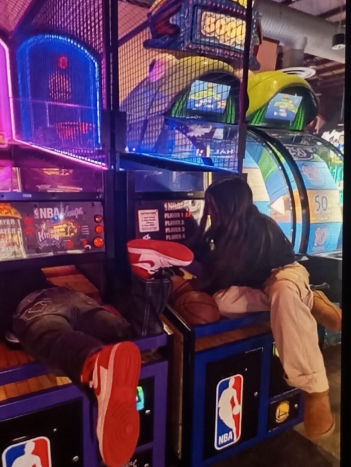 The scene is an indoor arcade setting in Beklar, Uzbekistan, characterized by dim ambient lighting and prominent neon illumination from multiple arcade machines. Two individuals are present. On the left, the lower torso and legs of a person are visible; they are wearing dark jeans and red and white athletic shoes, positioned horizontally across the base of an NBA-themed basketball arcade game. On the right, a second individual is seated on the console of an adjacent NBA-themed basketball arcade game. This person wears a dark long-sleeved top, light-colored trousers, and tan boots, with long dark hair partially obscuring their face as they look towards the machine. A brown basketball rests on the arcade console next to the seated individual. Another red and white athletic shoe is perched on a black vertical partition between the two individuals' arcade units. The arcade machines feature NBA logos, digital displays showing game information, and protective netting. Exposed ductwork is visible in the industrial-style ceiling in the background.