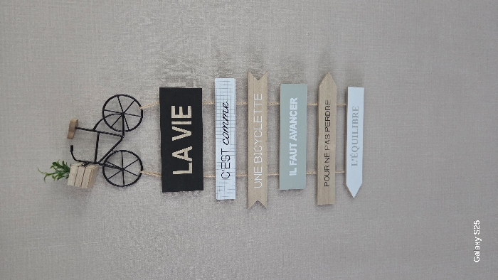 A decorative wall hanging is prominently displayed against a light grey, subtly textured wall surface in Ottonville, France. At the top, a black wireframe bicycle ornament features wooden seat and handlebar elements, with a small rectangular wooden planter box containing artificial green foliage attached to its front. Suspended vertically below the bicycle by light-colored twine are six individual horizontal plaques. The topmost plaque is black with white capitalized text reading "LA VIE". The second plaque is light blue with a grid pattern, displaying black cursive text "C'EST comme". The third plaque, light brown and shaped as an arrow pointing left, has white capitalized text "UNE BICYCLETTE". The fourth plaque is light blue-green with white capitalized text "IL FAUT AVANCER". The fifth plaque, light brown and shaped as an arrow pointing right, shows white capitalized text "POUR NE PAS PERDRE". The bottommost plaque is light blue, shaped as an arrow pointing left, and features white capitalized text "L’ÉQUILIBRE". The scene is static, depicting a fixed interior decoration. A "Galaxy S25" watermark is visible in the bottom left corner of the image.