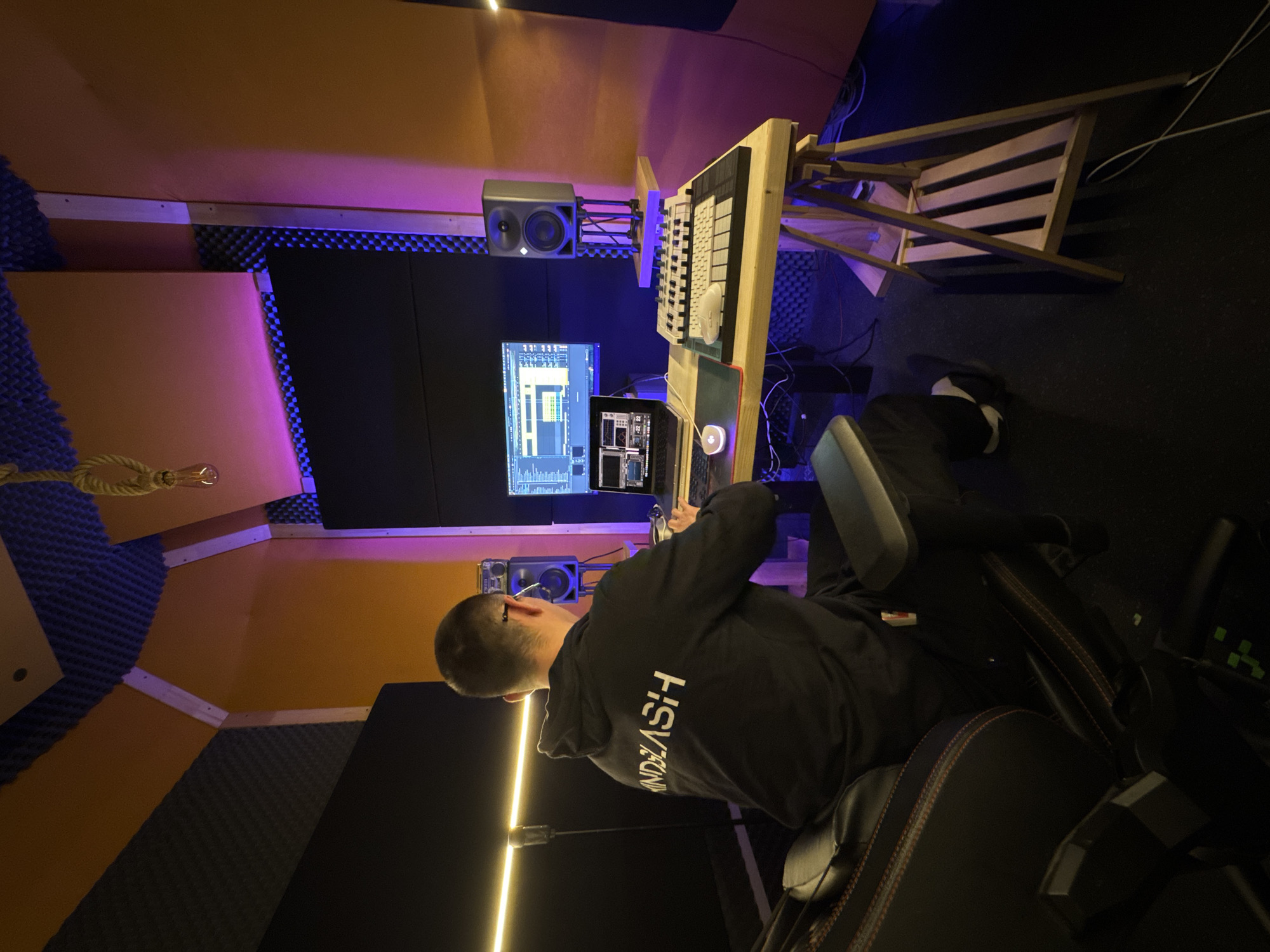 A man sits in a black gaming chair in what appears to be a home music studio. The studio features soundproofing panels on the walls, some painted orange. A pair of studio monitors are mounted above dual computer screens. A keyboard and other music production equipment are on a wooden stand. The man is wearing a black hoodie with white text, and black pants. The lighting includes purple and blue LEDs as well as a linear light source near the chair. There is no information in the image to confirm the location.