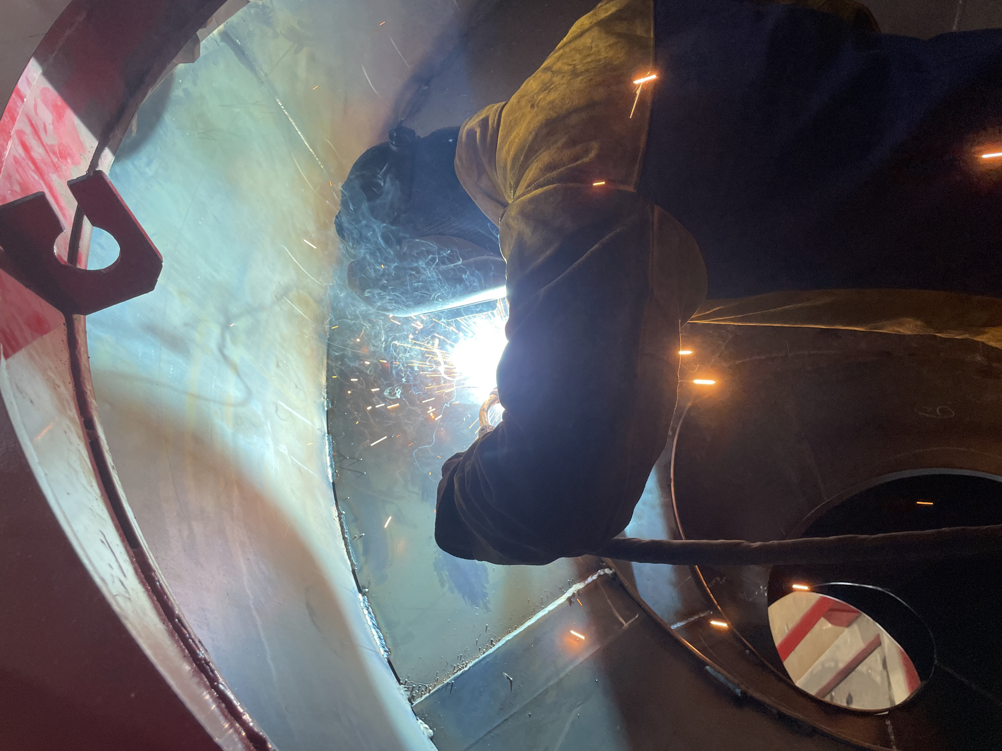 An individual is depicted performing welding inside a large, curved metal fabrication, likely within an industrial facility in Zaljevo, Montenegro