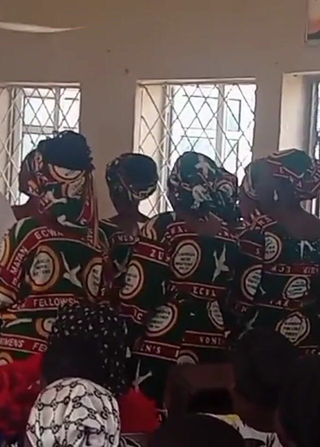 A group of women are standing and singing in what appears to be a church or meeting hall. They are facing away from the camera, towards a wall with windows and a doorway leading outside. The women are wearing matching green, red, and black patterned dresses with head coverings. The dresses feature the words "ECWA WOMENS FELLOWSHIP." There are other people sitting in the pews facing the women. A ceiling fan is visible. There are some signs and other items hanging on the walls. The lighting appears to be natural.