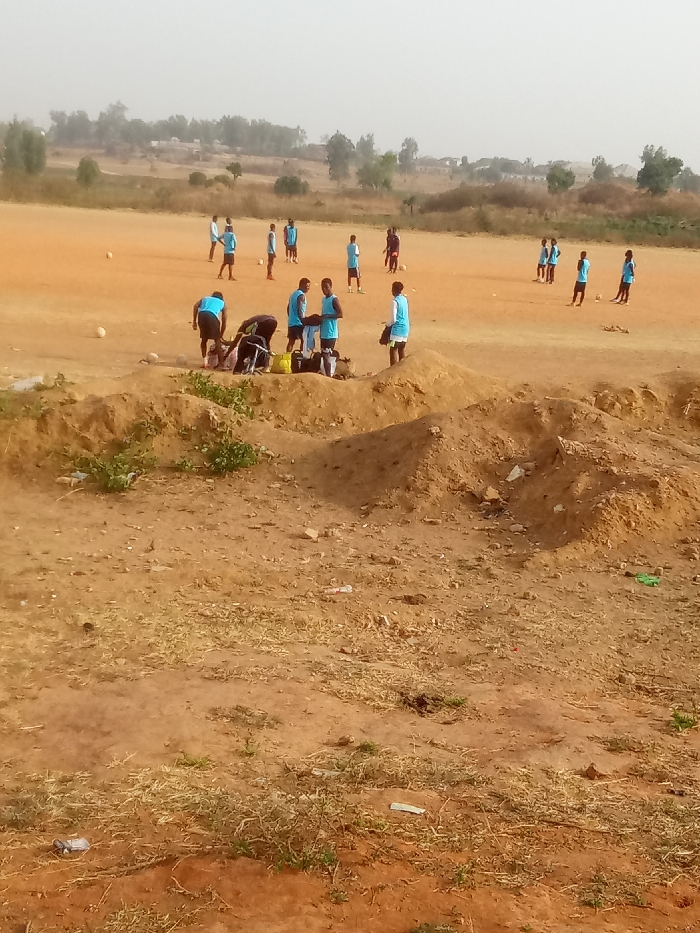 A group of young men wearing matching light blue shirts practice soccer on a red dirt field. Some players are actively playing, while others stand near bags and equipment. The foreground is filled with dirt and small mounds of soil with sparse vegetation. In the distance, trees and buildings are visible under a hazy sky. The scene appears to be in a rural or less developed area.
