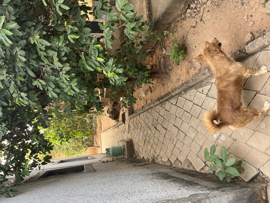 A tan dog stands on a tiled walkway adjacent to a building's textured wall. Lush green trees flank the scene, one close to the building and another further away. A gas tank sits by the building. A dirt area separates the walkway from the trees and the building. Small green plants grow sporadically along the walkway.